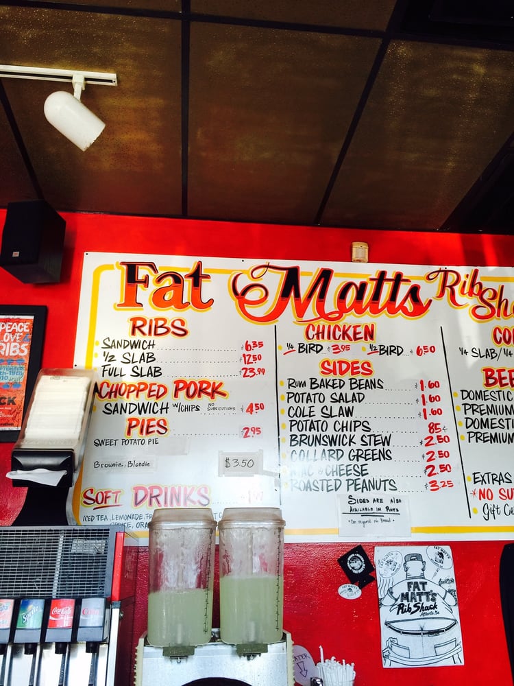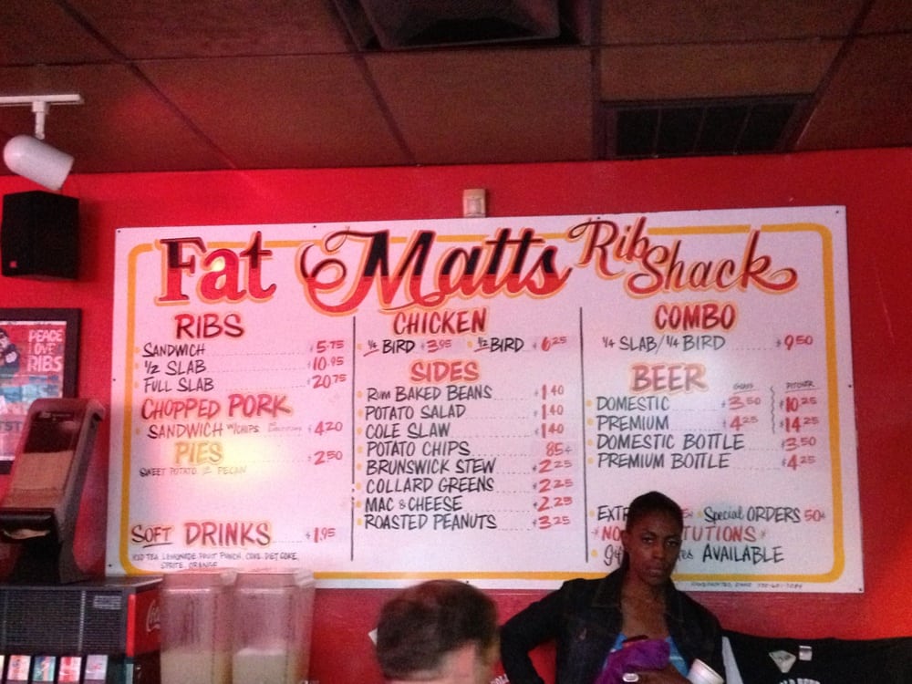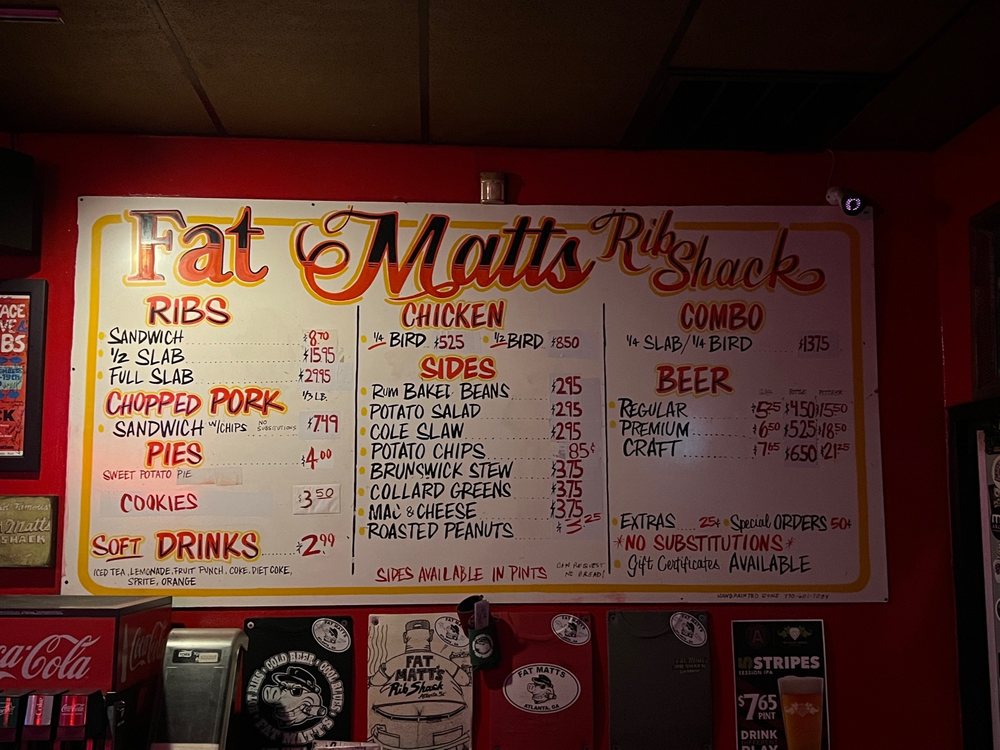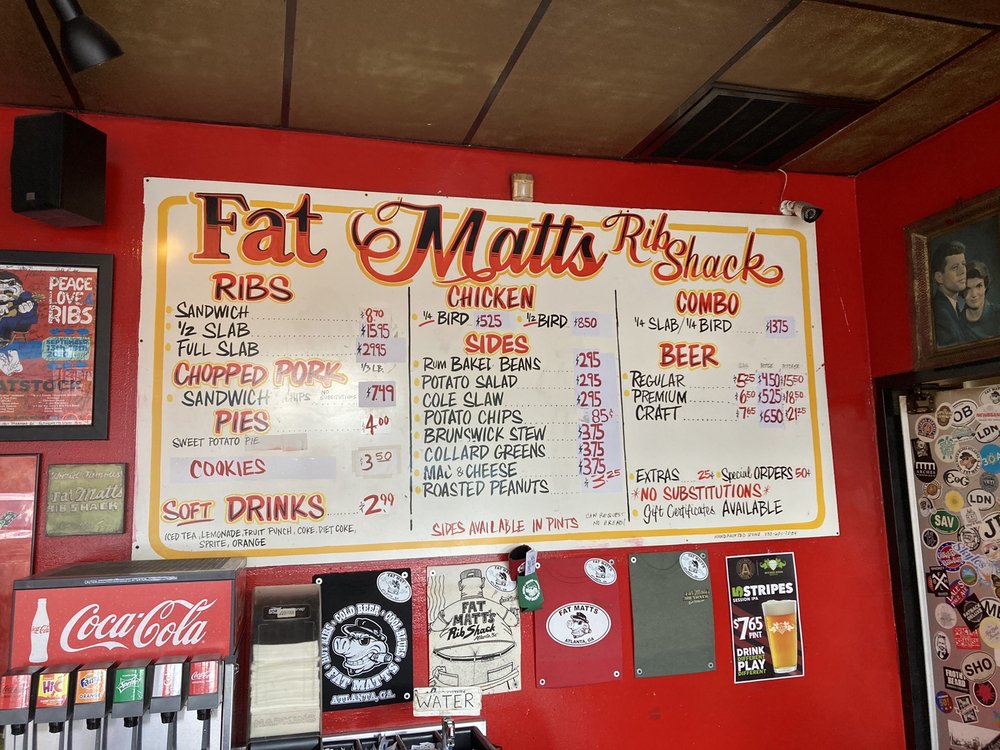 Introducing the menu at Fat Matt's Rib Shack, a beloved American barbeque spot in Atlanta. With a focus on ribs that are tender, smoky, and perfectly seasoned, this joint has won over the hearts of locals and visitors alike. The pulled pork sandwich and chicken breast sandwich are also standout dishes, with rich, juicy flavors that will leave you craving more. The homemade sides like collard greens and potato salad are top-notch, adding to the whole experience. The laid-back atmosphere, friendly service, and live music give this place a genuine, local feel that keeps customers coming back for more. Whether you're a BBQ aficionado or just looking for a memorable dining experience, Fat Matt's Rib Shack is a must-try in Atlanta.