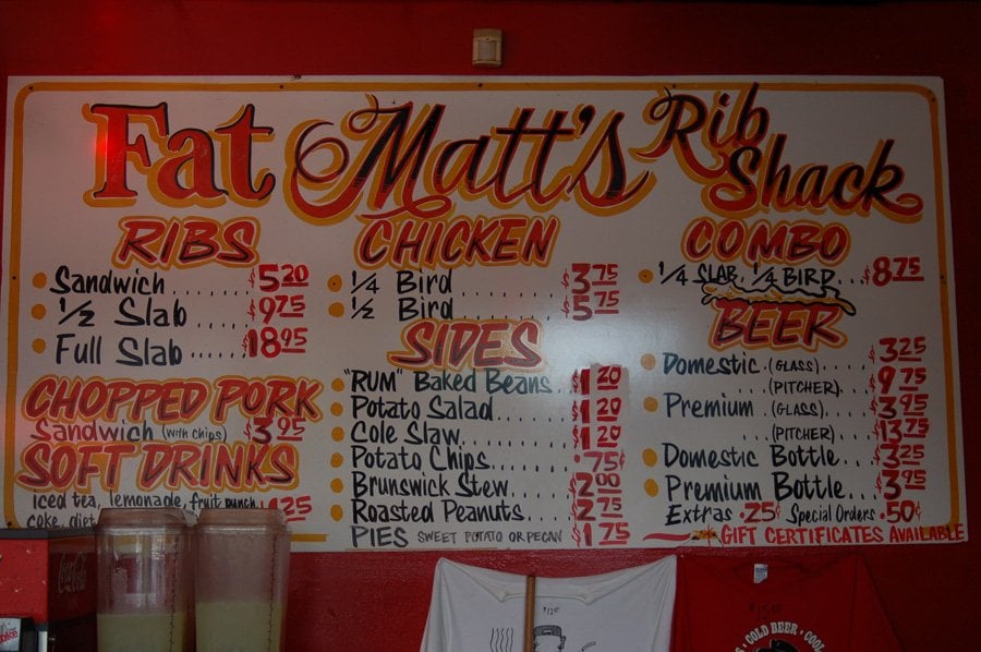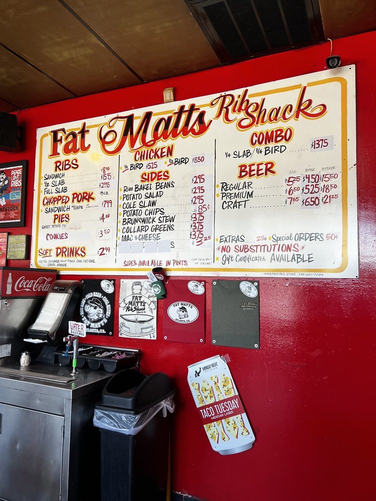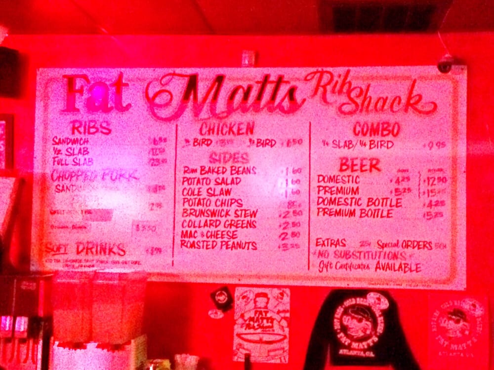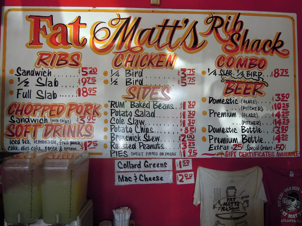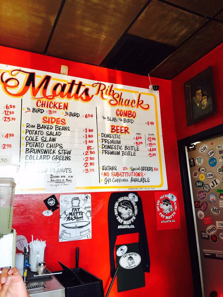 Introducing the menu at Fat Matt's Rib Shack, a beloved American barbeque spot in Atlanta. With a focus on ribs that are tender, smoky, and perfectly seasoned, this joint has won over the hearts of locals and visitors alike. The pulled pork sandwich and chicken breast sandwich are also standout dishes, with rich, juicy flavors that will leave you craving more. The homemade sides like collard greens and potato salad are top-notch, adding to the whole experience. The laid-back atmosphere, friendly service, and live music give this place a genuine, local feel that keeps customers coming back for more. Whether you're a BBQ aficionado or just looking for a memorable dining experience, Fat Matt's Rib Shack is a must-try in Atlanta.